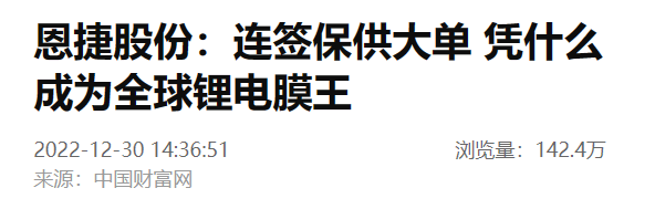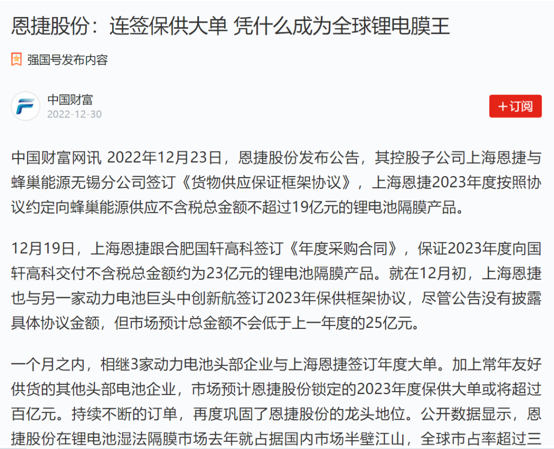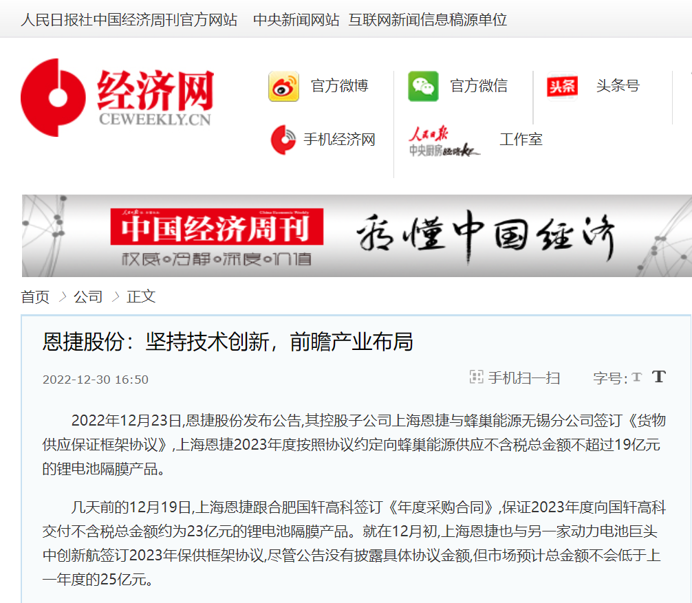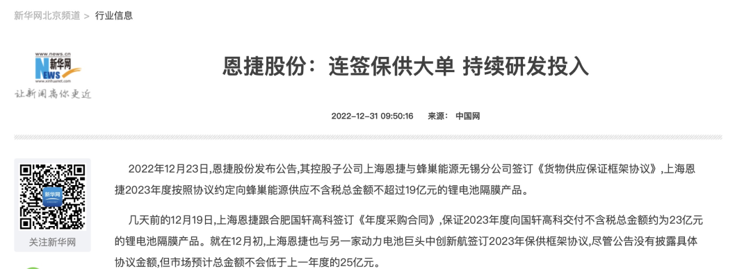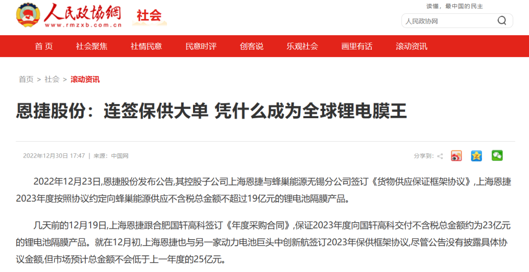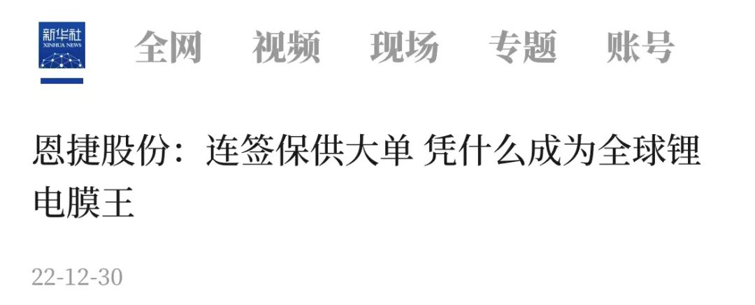 2022年12月,,,,,,,,beats365股份与中立异航、国轩高科、蜂巢能源签署2023年保供协议,,,,,,,,其中,,,,,,,,国轩高科的订单总额约23 亿元,,,,,,,,蜂巢能源的订单总额不凌驾19亿元。。。。。。学习强国、新华社、新华网、经济网、人民政协网等多家媒体深度报道“膜王”beats365的卓越体现。。。。。。