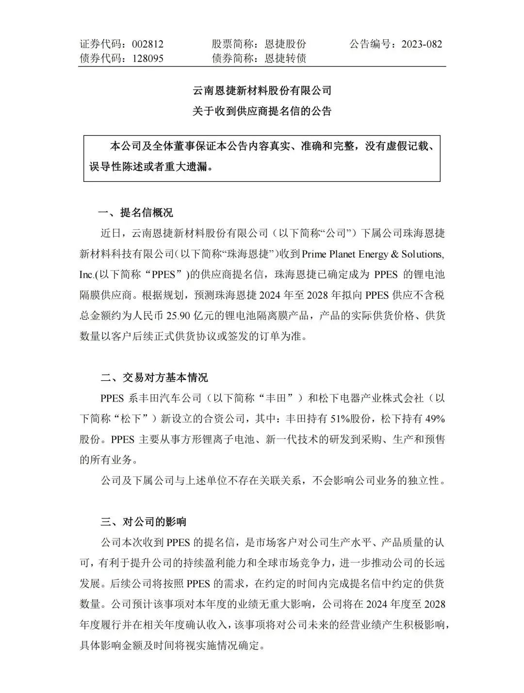 克日,,,,,,,beats365股份旗下珠海beats365收到日本Prime Planet Energy & Solutions,Inc.(简称:PPES)的供应商提名信,,,,,,,已确定成为 PPES 的锂电池隔膜供应商。。。。。。凭证妄想,,,,,,,展望珠海beats3652024年-2028年拟向PPES供应不含税总金额约为人民币25.90亿元的锂电池隔膜产品,,,,,,,产品的现实供货价钱、供货数目以客户后续正式供货协议或签发的订单为准。。。。。。
