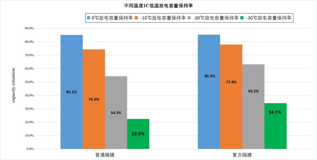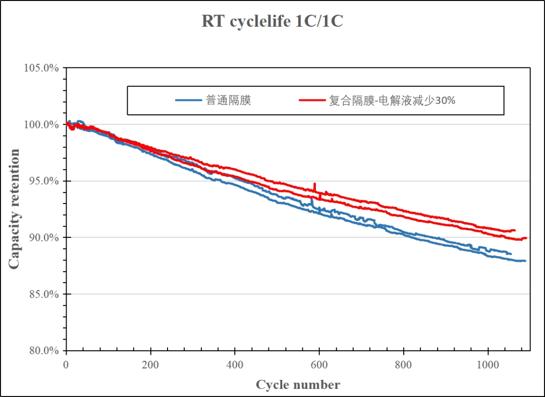 从性能上看,,,,,,,,不但低温性能突出,,,,,,,,电芯运用后电阻比通例隔膜显著降低以及在1C/1C充放电倍率下循环1000次的实验中发明,,,,,,,,使用该复合膜的电芯电解液保有量与通例隔膜相比同比镌汰30%的情形下仍然可以坚持较高的循环容量坚持率。。。。。。