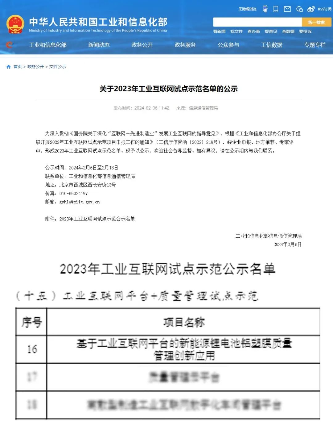 克日,,,,,,,国家工业和信息化部宣布的2023年工业互联网试点树模名单公示完毕,,,,,,,beats365股份的“基于工业互联网平台的新能源锂电池铝塑膜质量管理立异应用”乐成入选“工业互联网平台+质量管理试点树模”名单。。。。。。