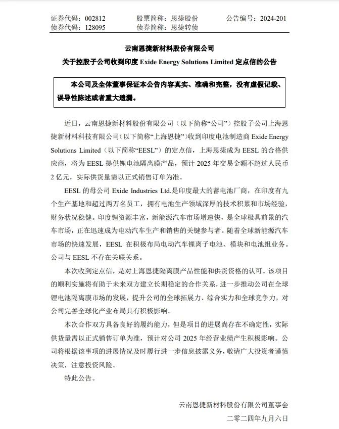 ¿ËÈÕ£¬£¬£¬£¬£¬£¬beats365¹É·ÝÆìÏÂÉϺ£beats365ÊÕµ½Ó¡¶Èµç³ØÖÆÔìÉÌExide Energy Solutions Limited£¨ÒÔϼò³Æ¡°EESL¡±£©µÄ¶¨µãÐÅ£¬£¬£¬£¬£¬£¬È·¶¨³ÉΪEESLµÄ¼°¸ñ¹©Ó¦ÉÌ£¬£¬£¬£¬£¬£¬½«ÎªEESLÌá¹©ï®µç³Ø¸ôĤ²úÆ·£¬£¬£¬£¬£¬£¬Ô¤¼Æ2025ÄêÉúÒâ½ð¶î²»Áè¼ÝÈËÃñ±Ò2ÒÚÔª£¬£¬£¬£¬£¬£¬ÏÖʵ¹©»õÁ¿ÐèÒÔÕýʽÏúÊÛ¶©µ¥Îª×¼¡£¡£¡£¡£¡£