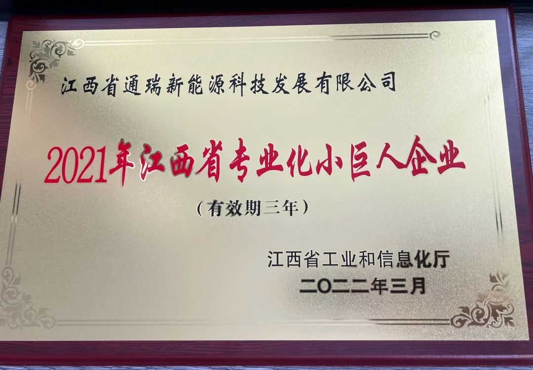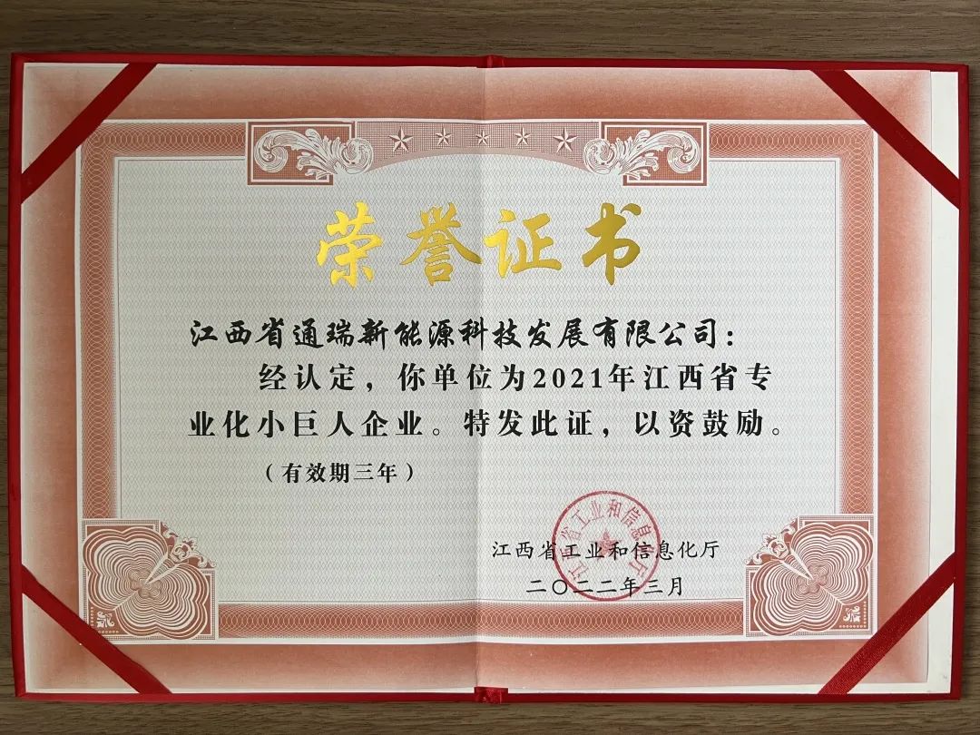 今年3月,,,,,,江西省工业和信息化厅宣布了“2021年江西省专业化小巨人”企业名单,,,,,,江西省通瑞新能源科技生长有限公司荣获省级“专业化小巨人”称呼。。。。。。。