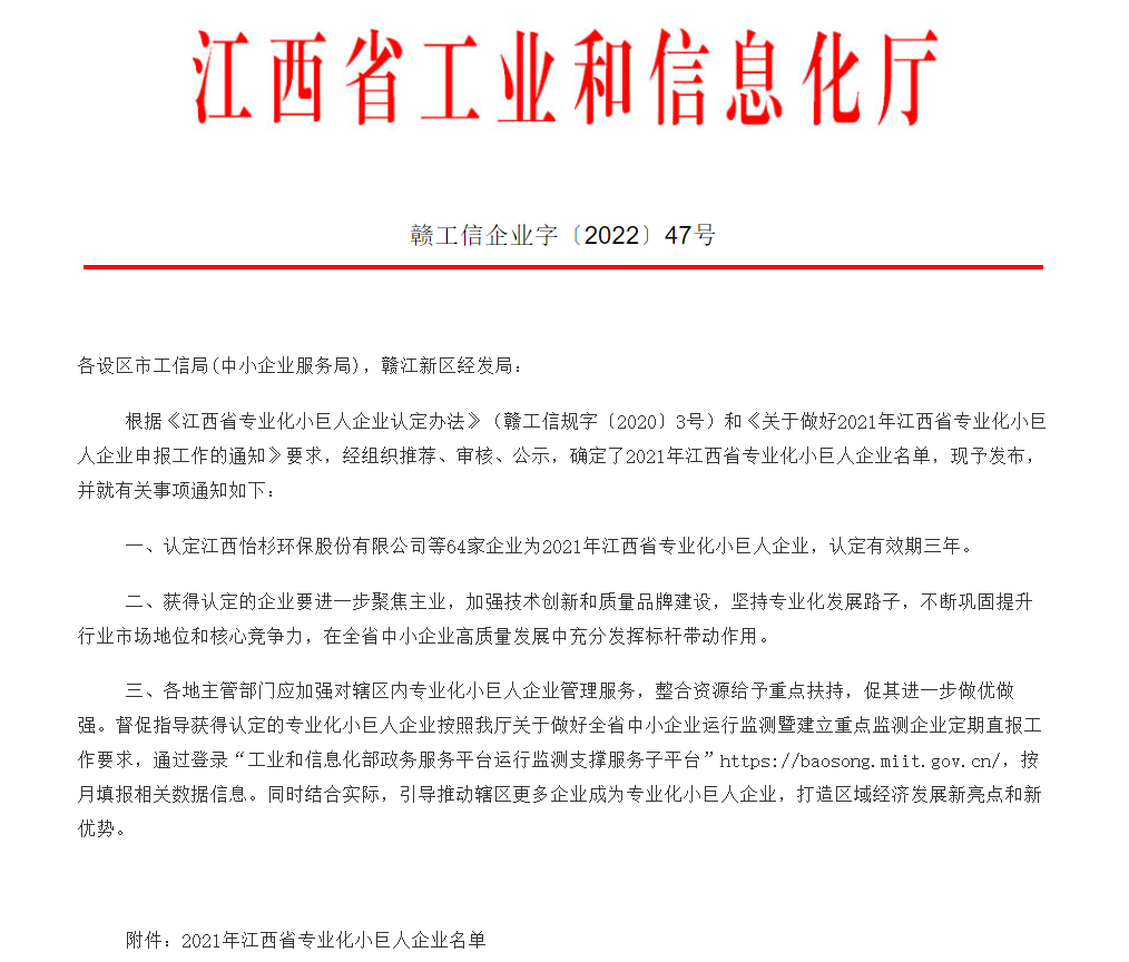 克日,,,,,,江西通瑞获得了由江西省工业和信息化厅揭晓的“2021年江西省专业化小巨人企业”声誉证书。。。。。。。