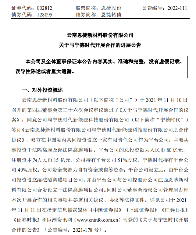 此前,,,,,,,2021年11月,,,,,,,beats365股份通告与宁德时代签署合作协议,,,,,,,双方拟在中国境内配合投资设立一家有限责任公司作为平台公司,,,,,,,主要从事投资干法隔离膜及湿法隔离膜项目。。。。。。。。