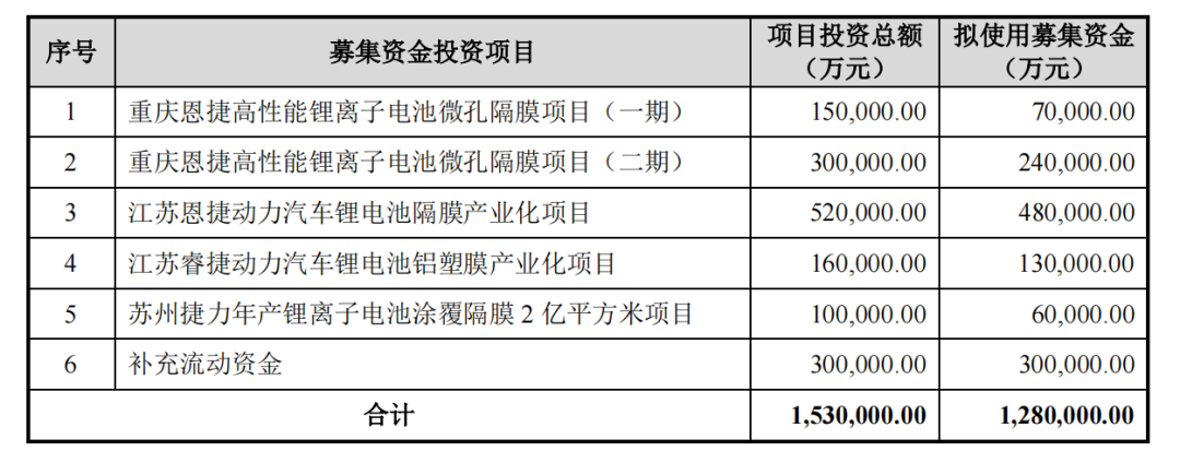 2021年11月,,,,,,beats365股份披露非果真刊行预案,,,,,,拟向不凌驾35名特定投资者非果真刊行股票数目不凌驾267,721,996股,,,,,,预计募资不超128亿元,,,,,,将用于重庆beats365高性能锂离子电池微孔隔膜项目、江苏beats365动力汽车锂电池隔膜工业化项目、江苏睿捷动力汽车锂电池铝塑膜工业化项目、苏州捷力年产锂离子电池涂覆隔膜2亿平方米项目及增补流动资金。。。。。。