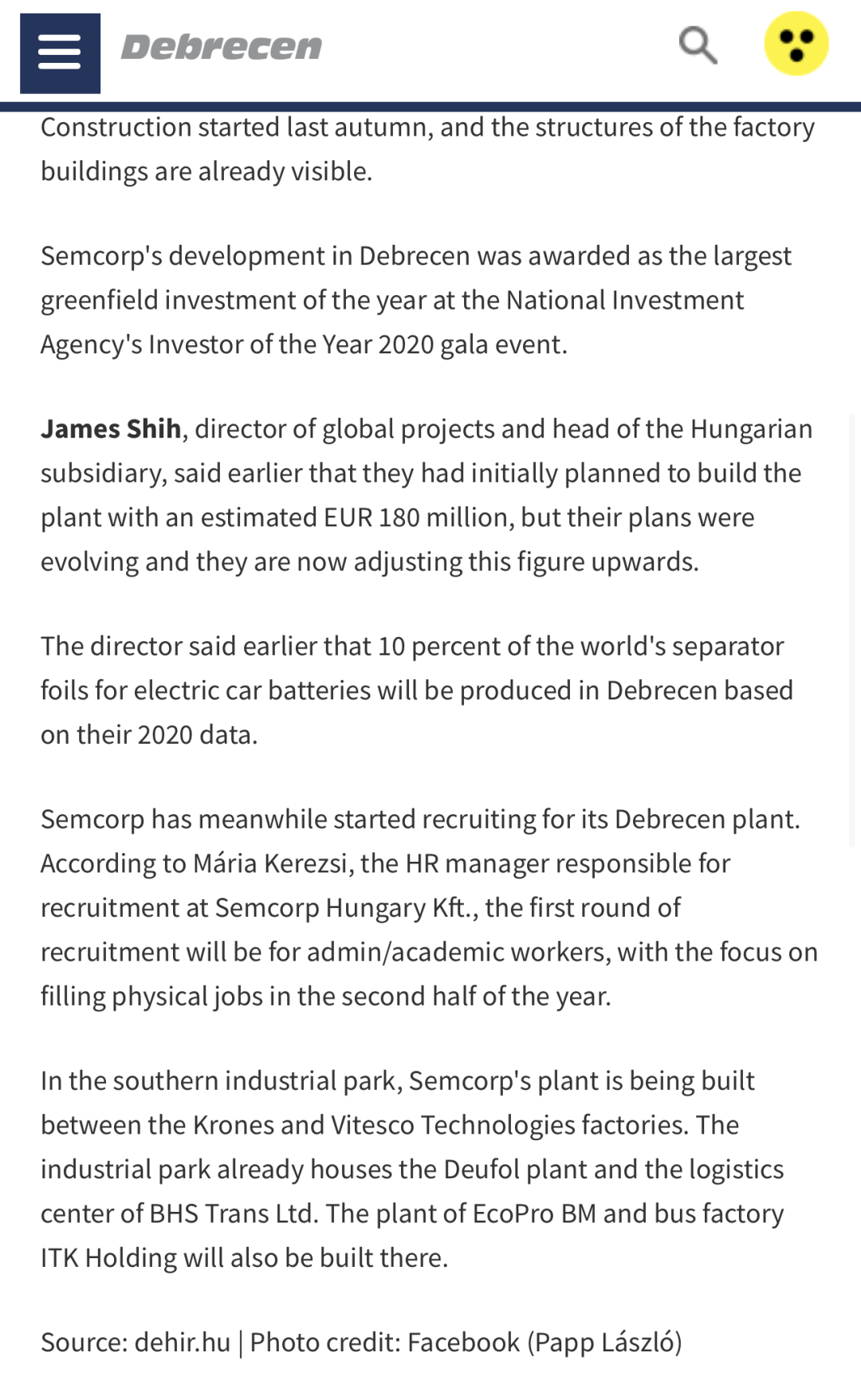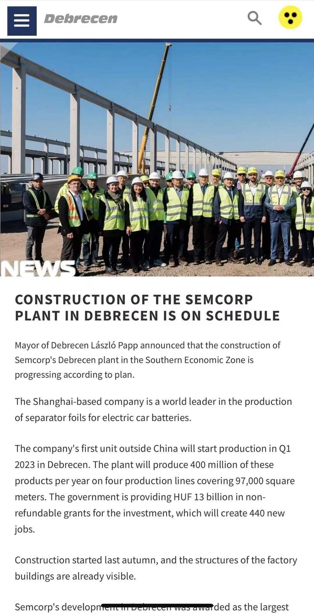 “Mayor of Debrecen László Papp announced that the construction of Semcorp's Debrecen plant in the Southern Economic Zone is progressing according to plan. The Chinese company is a world leader in the production of separator foils for electric car batteries.”