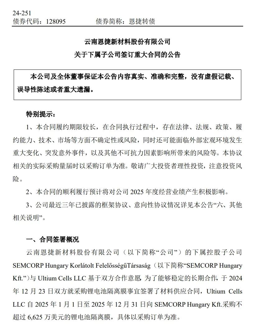 12月23日,,,,,,beats365股份披露控股子公司匈牙利beats365与美国Ultium Cells LLC基于双方合作意愿,,,,,,Ultium Cells LLC自2025年1月1日至2025年12月31日向匈牙利beats365采购不凌驾6,625万美元的锂电池隔膜,,,,,,详细以采购订单为准。。。。。